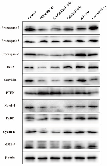 To understand the mechanism for the anti-proliferative effect triggered by LA-OEI/miR-34a nanoparticles, the cell apoptosis was analyzed through the Annexin V-FITC/PI dual staining of the transfected cells using FACS (Figure 5). Clearly, no significant cell apoptosis was detected in free miR-34a and OEI/miR-34a groups with early apoptotic ratios of 3.02% and 3.89%, respectively. In contrast, miR-34a transfection using LA-OEI and PEI as carriers could realize obvious early apoptosis. Meanwhile, LA-OEI/miR-34a nanoparticles could achieve much stronger cell apoptosis than PEI/miR-34a nanoparticles (23.36% vs. 13.99%), which was attributed to the enhanced intracellular delivery of miR-34a. However, the reactive oxygen species (ROS) level showed that the transfection of nanoparticles did not influence the intracellular ROS level, using DCFH-DA as a probe (Figure S8). Thus, the induction of cell apoptosis by miR-34a transfection was not associated with the improvement of intracellular ROS level, and the apoptosis-inducing mechanism needed to be systematically discussed. Subsequently, the expression level of proteins related to the cell apoptosis was detected through Western blotting (Figure 6). The procaspase-3 level was dramatically decreased after the delivery of miR-34a using PEI and LA-OEI as carriers, indicating the precursor cleavage of procaspase-3 and the activation of caspase-3. After the caspase-3 activation, PARP (the specific substrate of caspase-3) was cleaved, which was essential for the occurrence of cell apoptosis. In comparison to the control group, down-regulated expression of PARP could be observed in LA-OEI- and PEI-mediated miR-34a delivery. Additionally, compared with procaspase-8, there was a significant down-regulation of procaspase-9 obtained after the delivery of miR-34a using LA-OEI and PEI as carriers, suggesting the cleavage of procaspase-9 to activate the caspase-9. Consistently, the relative activities of caspae-3 and -9 were measured to be increased after the treatment with these two nanoparticles (Figure S9). Meanwhile, no obvious activation of caspase-8 has been found for the cells treated with LA-OEI/miR-34a and PEI/miR-34a nanoparticles. The activation of caspase-9 indicated that the carriers-mediated miR-34a delivery induced the cell apoptosis through the mitochondria-dependent signaling route. Interestingly, the miR-34a delivery could reduce the expression level of survivin and Bcl-2. As known, Bcl-2 and survivin have been identified to be over-expressed in a large number of cancer cells and play a critical role in the tumorigenesis and therapeutic resistance in the cancer treatment [35,36]. Thus, the decreased expression of Bcl-2 and survivin induced by miR-34a transfection could not only enhance the apoptotic effect but also hinder the drug-resistance of cancer cells. Moreover, the miR-34a transfection could improve the PTEN expression level. Since PTEN has been proposed as a well-characterized tumor suppressor that was mutated or deficient in many human cancers [37], the miR-34a-mediated restoration of PTEN could inhibit the cell proliferation and thereby enhance the therapeutic efficacy.