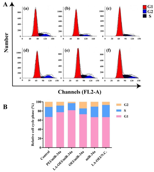 Except for the cell apoptosis, the arrest of cell cycle was another important reason leading to the inhibition of cell proliferation. Compared to the control group, a large population of cells could be arrested at G1 phase after the miR-34a transfection, suggesting the effective arrest of cell cycle at G1 phase (Figure 7 and Figure S10). In particular, the G1 phase ratio of 82.50% was obtained for the LA-OEI/miR-34a nanoparticles, which was much higher than the miR-34a transfection by PEI (78.30%) and OEI (74.58%). Meanwhile, there was no significant improvement of G1 phase ratio in free miR-34a and LA-OEI/N.C. This phenomenon probably relied on the reduced Cyclin D1 level after the miR-34a transfection (Figure 6), as Cyclin D1 was accepted to participate in the G1/S transition [38]. In summary, LA-OEI/miR-34a transfection could achieve a stronger anti-tumor response than OEI- and PEI-mediated miR-34a delivery, in a manner of triggering the cell apoptotic effect and the cell cycle arrest at G1 phase. Thus, the intracellular delivery of miR-34a using LA-OEI as a carrier could potentially be an important route to achieve the cancer gene therapy.