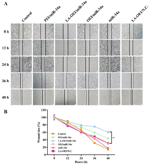 The LA-OEI/miR-34a nanoparticles’ anti-migration effect was evaluated by wound scratch and Transwell migration assays. In the wound scratch assay, the cells were inoculated in 6-well plates at a density of 5.0 × 105 cells/well and cultured in 2 mL of 10% FBS-containing DMEM to obtain a confluence of 90%. Then mechanical scratch was generated using a sterile pipette tip in the cell monolayer, and the cells were treated using different nanoparticles in FBS-free DMEM (2 μg/mL miR-34a in each group). Subsequently, the cells were cultured in DMEM containing 10% FBS for different time and detected using an IX71 fluorescence microscopy (Olympus, Tokyo, Japan) to capture the wound area. In the Transwell migration assay, the cell culture and miR-34a transfection were performed as described in Section 3.6. The cells after the transfection (1.0 × 104 cells) were added in the upper part of Transwell chamber with 8-μm pores (Costar, Corning, NY, USA) harboring 200 μL of FBS-free DMEM, while 600 μL of 10% FBS-containing DMEM was placed into the lower part of the chamber. After 24 h, the mechanical wiping was performed to remove the non-migrated cells on the upper part of membrane. The cells migrating to the lower membrane surface were fixed in 75% cold ethanol and stained with 0.1% crystal violet, and the anti-migration effect was evaluated by IX71 fluorescence microscopy (Olympus, Tokyo, Japan).