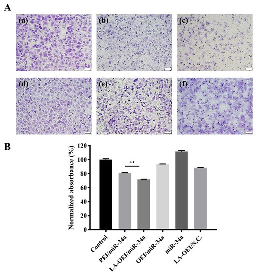 The anti-migration effect of HeLa cells after the miR-34a transfection using Transwell migration assay. (A) The staining with 0.1% crystal violet for the cells which have migrated to the lower surface of membrane: (a) control, (b) PEI/miR-34a, (c) LA-OEI/miR-34a, (d) OEI/miR-34a, (e) miR-34a and (f) LA-OEI/N.C. The scale bar is 50 μm. (B) Quantitative analysis of the cells which have migrated to the lower surface of membrane. Data were presented as the mean value ± SD of triplicate experiments (** p < 0.01).