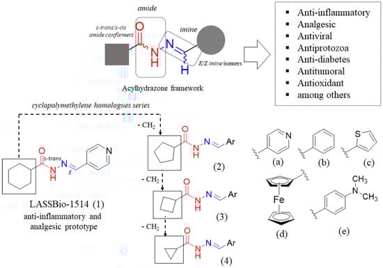 - Thota, S.; Rodrigues, D.A.; Pinheiro, P.S.M.; Lima, L.M.; Fraga, C.A.M.; Barreiro, E.J.B. N-Acylhydrazones as drugs. Bioorg. Med. Chem. Lett. 2018, 28, 2797–2806. [Google Scholar] [CrossRef]