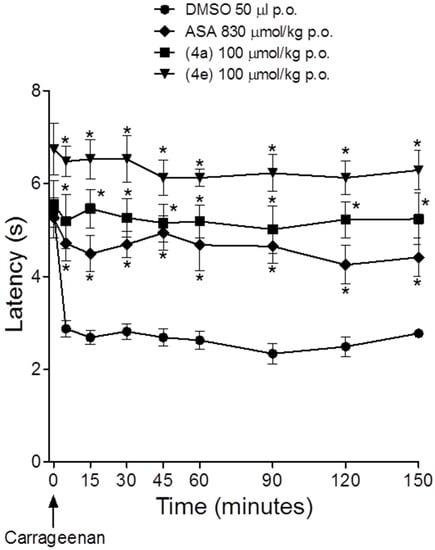 3.2.6. Carrageenan-Induced Nociception