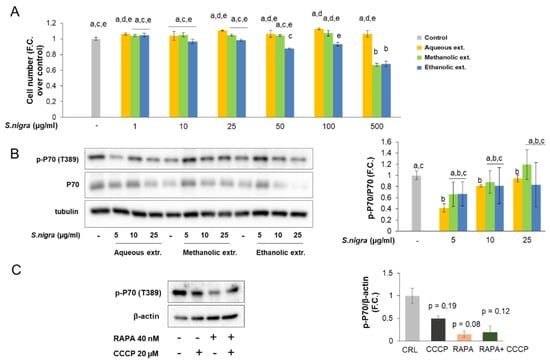 Effect of aqueous, methanolic, and ethanolic extracts from S. nigra flowers on cell number (A) and mTORC1 signaling (B) in SH-SY5Y cells. (C) Western blots from SH-SY5Y cells treated with the mitochondrial uncoupler CCCP (20 µM) for 2 h in the presence or absence of 40 nM of rapamycin for 24 h with densitometric quantification of p-p70. We used rapamycin (RAPA) as a positive control to inhibit mTORC1 signaling. Values are means ± SD. n = 3. Values are expressed as a fold change (F.C.) relative to control condition. Different letters indicate statistically significant differences (p < 0.05) among groups. In panel C, p values are indicated compared to the indicated control.
