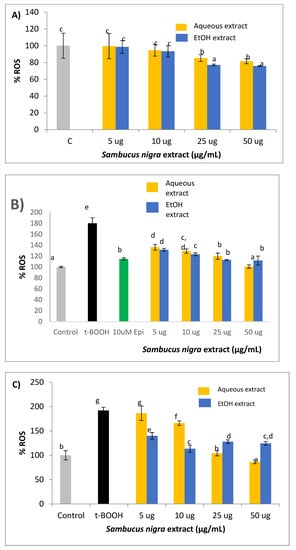 (A) Direct effect, (B) Pre-treatment, and (C) Co-treatment effects of aqueous and ethanolic extracts from S. nigra flowers on ROS generation in SH-SY5Y cells. Values are means ± SD, n = 4. Values are expressed as a percent relative to control condition. Different letters indicate statistically significant differences (p < 0.05) among groups.