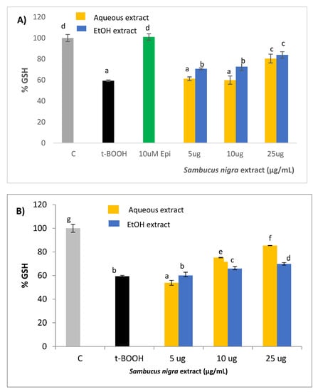 Protective effect of (A) Pre-treatment or (B) Co-treatment of aqueous and ethanolic extracts from S. nigra flowers on GSH levels of SH-SY5Y cells. Values are means ± SD, n = 4. Values are expressed as a percent relative to activity of control condition. Different letters indicate statistically significant differences (p < 0.05) among groups.