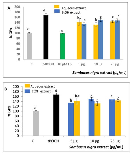 The activity of glutathione-dependent enzymes is essential to prevent/reduce the cytotoxicity of ROS. Enhancement of GPx and GR are critical mechanisms of the cell defense system to face ROS overproduction in conditions of oxidative insults [36,46]. An increase in GPx activity faces ROS overproduction at the expense of GSH, which becomes oxidized and is recovered again to GSH by an activated GR activity. Nevertheless, a prompt return of the antioxidant enzyme activities to basal values once the challenge is surpassed will place the cell in a favorable condition to deal with a new oxidative insult. Thus, the fact that most of the pre- and co-treatment conditions of SH-SY5Y cells with aqueous and ethanolic S. nigra extracts managed to avert the long-lasting rise in the activities of GPx and GR induced by oxidative stress guaranteed that the cells were in optimum conditions to survive further oxidative challenges. Again, although a similar antioxidant defense response has been previously reported for other plant extracts and different cell types (see above), this crucial defense mechanism for chemo-protection has never been described for neuroblastoma cells submitted to an oxidative stress. Based on a previous report [22] where pre-treatment of SH-SY5Y with cocoa flavanol epicatechin was able to fully recover stress-induced ROS to basal pre-stress values, this same compound was used at 10 µM as a positive control for all pre-treatment assays related to ROS and antioxidant defenses GSH, GPx, and GR. Further to what was reported for ROS values by Ramiro-Puig et al. [25], the results confirm epicatechin as a chemo-protective compound for all tested antioxidant defenses in neuroblastoma cells.