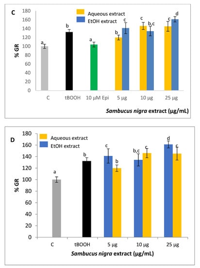 Protective effect of aqueous and ethanolic extracts from S. nigra flowers on the enzymatic antioxidant defenses of SH-SY5Y cells. (A,C) Effect of co-treatment of S. nigra extracts on GPx and GR values. (B,D) Effect of pre-treatment of S. nigra extracts on GPx and GR values. Values are expressed as a percent relative to activity of control condition and are means ± SD, n = 4. Different letters indicate statistically significant differences (p < 0.05) among groups.