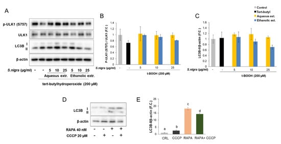 (A–C) Pre-incubation of SH-SY5Y cells with aqueous or ethanolic extracts from S. nigra flowers modulates autophagy in response to oxidative stress induced by tert-butylhydroperoxide treatment (200 µM, 30 min). (D,E) Western blots from SH-SY5Y cells treated with the mitochondrial uncoupler CCCP for 2 h in the presence or absence of 40 nM of rapamycin for 24 h, with densitometric quantification LC3-II. We used rapamycin (RAPA) as a positive control to stimulate autophagy. Values are means ± SD, n = 3. Values are expressed as a percent relative to activity of control condition. Different letters indicate statistically significant differences (p < 0.05) among groups.