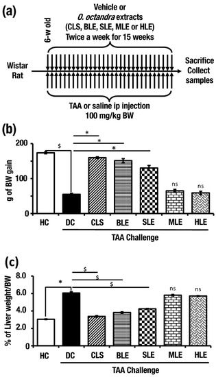 Aqueous extracts from O. octandra prevents body and liver weight retardation during the TAA challenge. (a) Experimental procedure. (b) Body weight gain from the beginning to the end from each of the seven groups of rats (HC, DC CLS, BLE, SLE, MLE or HLE treatment model) during the TAA challenge. The values are indicated in grams of increase/decrease using the starting weight. (c) Liver/body weight ratio at the end from each of the seven groups of rats. Error bars represent standard errors of the means (SEM) in each group (n = 5). The statistical significance has been indicated in two ways; (i) disease induction effect during the TAA challenge (HC vs. DC), (ii) O. octandra treatment consequence (DC vs. CLS, BLE, SLE, MLE and HLE), with one-way ANOVA followed by the Dunnett’s test. $, significant decrease; $, p = 0.05 to 0.01. *, significant increase; *, p = 0.05 to 0.01. ns, p > 0.05.