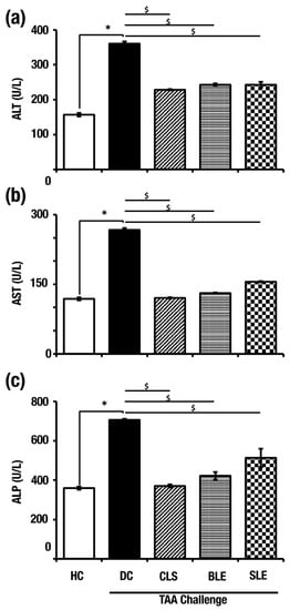 To test liver functions, the serum alanine aminotransferase (ALT), aspartate aminotransferase (AST) and alkaline phosphatase (ALP) levels were measured at the end of the treatment period. The DC group showed significantly higher ALT (360.8 ± 6.11 U/L), AST (267 ± 4.13 U/L) and ALP (776.1 ± 5.81 U/L) values compared to HC, which were 156.78 ± 4.86, 118.62 ± 3.17 and 359.6 ± 7.73 U/L, respectively. In comparison to the DC, significantly low serum concentrations of ALT, AST and ALP were observed in the CLS (222.5 ± 1.61, 120.68 ± 1.34 and 370.26 ± 7.79 U/L), BLE (242.88 ± 3.81, 130.92 ± 1.26 and 422.66 ± 18.85 U/L) and SLE (242.86 ± 8.02, 155.4 ± 1.42 and 513.2 ± 46.55 U/L) groups. (Figure 2a–c). The findings confirm the hepatocellular damage in DC as evident by significantly higher enzyme levels. Treatments of CLS, BLE and SLE have shown protection against TAA-induced hepatotoxicity by decreasing intracellular enzyme leakage.