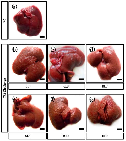 Aqueous extracts (CLS, BLE and SLE) demonstrated more potency to protect the liver against TAA challenge. (a) HC livers showed a normal appearance with a smooth surface. (b) Numerous nodules of various sizes can be seen on the liver surface of DC. (c) Livers treated with CLS showed a smooth surface. (d) Small nodules can be seen on the surfaces of livers treated with BLE and (e) SLE. (f,g) Nodules of variable sizes were present on the surfaces of livers treated with MLE and HLE. Bar = 10 mm.