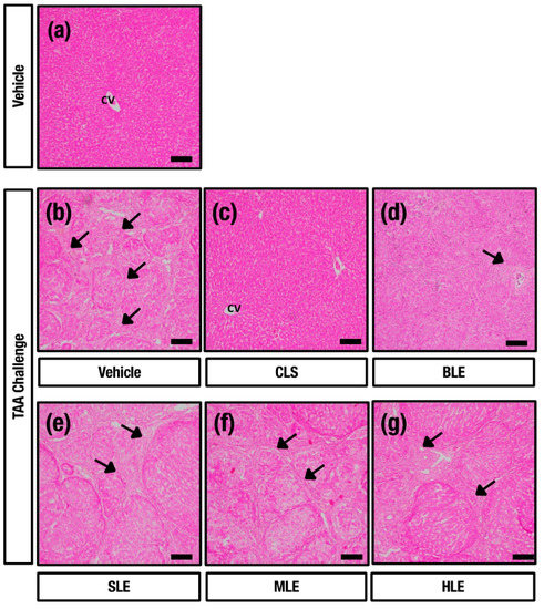 Hepatoprotective effect of aqueous extracts (CLS and BLE) against TAA-induced liver cirrhosis. Histopathological sections of livers (stained with HE) from HC, DC and different leaf extract treatments of O. octandra CLS, BLE and SLE) after 15 weeks. (a) HC livers showed normal hepatic architecture and without histopathological changes. (b) Regenerating hepatic nodules formed by complete fibrous bridges were seen in the livers of DC. (c) Animals treated with CLS showed normal hepatic architecture. (d) Incomplete fibrous bridge formation was seen in the animals treated with BLE. (e–g) Complete fibrous bridge formation with regenerating hepatocytes was observed in animals treated with SLE, MLE and HLE, respectively. CV, central vein. Bar = 100 µm.