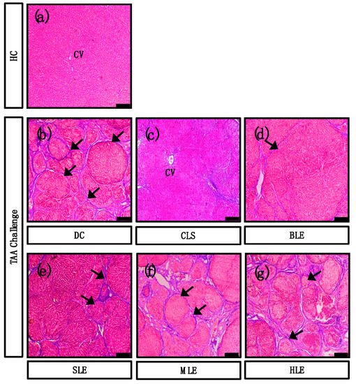 Aqueous extracts (CLS and BLE) showed an anti-fibrotic effect against TAA-induced liver cirrhosis. Histopathology of (stained with Masson’s trichrome) HC, DC and different leaves extracts of O. octandra treated CLS, BLE and SLE) livers at 15 weeks. (a) In the HC livers, collagen fibers were mainly seen in the vascular wall. (b) Increased collagen deposition in the thickened fibrous bridges was seen in DC. (c) A small amount of collagen was detected mainly in the periportal and centrilobular areas in livers treated with CLS. (d) Livers treated with BLE showed a few collagen deposits as thin fibrous bridges. (e–g) Increased amounts of collagen with thickened fibrous bridges were observed in livers treated with SLE, MLE and HLE. CV, central vein. Arrows indicate collagen depositions. Bar = 100 µm.