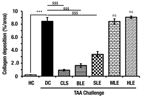 Treatments with aqueous extracts (CLS, BLE and SLE) showed a minimum amount of collagen deposits, indicating their hepatoprotective activity in TAA-induced liver cirrhosis. MT-stained liver sections were quantified using image J software. The values are indicated as percentages of the total surface. Error bars represent standard errors of the means (SEM) in each group (n = 5). The statistical significances are shown in two ways; (i) disease induction effect during the TAA challenge (HC vs. DC), (ii) O. octandra treatment consequence (DC vs. CLS, BLE, SLE, MLE and HLE), with one-way ANOVA followed by the Dunnett’s test. $, significant decrease; $$$, p < 0.001. *, significant increase; ***, p < 0.001. ns, p > 0.05.