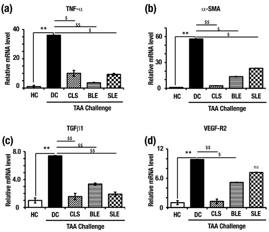 mRNA expressions confirmed the establishment of liver cirrhosis in DC and the hepatoprotective effect of aqueous extracts in the other treatments. (a) Tnf-α, (b) α-Sma, (c) Tgf-β1 and (d) Vegf-R2 mRNA expressions determined by qPCR. Expression levels are normalized to 18S mRNA level. Error bars represent standard errors of the means (SEM) in each group (n = 5). The statistical significances are indicated in two ways; (i) disease induction effect during the TAA challenge (HC vs. DC), (ii) O. octandra treatment consequence (DC vs. CLS, BLE and SLE), with one-way ANOVA followed by the Dunnett’s test. $, significant decrease; $, p = 0.01 to 0.05, $$, p = 0.001 to 0.01, *, significant increase; **, p = 0.001 to 0.01. ns, p > 0.05.