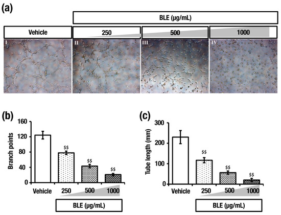 The effect of BLE on endothelial cell sprouting was studied using human umbilical vein endothelial cells (HUVECs) cultured on the basement membrane matrix (Matrigel, BD Biosciences, Franklin Lakes, NJ, USA) as described previously (n = 3) [28].
