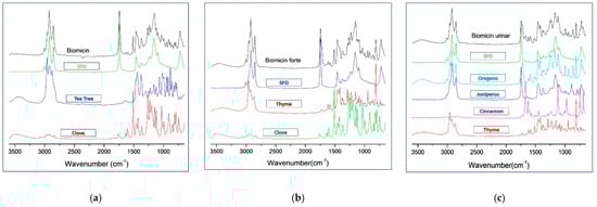 As seen in Section 2.1, the contribution of individual essential oils gives specific patterns of the spectra, as shown in Figure 1 for oily formulations, where Biomicin urinary had the most complex composition, and the contribution of individual EOs can be identified. The peak shapes and intensities reflected a good discrimination between the three formulations, as shown in Figure 2a–c and Table 1. The recognition markers for each formulation expressed by wavenumbers (WNs) and peak intensities can be used for a fast screening of these formulations in any laboratory with an FTIR spectrometer.