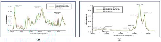 Based on these observations, Figure 2 shows the superposed ATR-FTIR-MIR fingerprints of Biomicin, Biomicin Forte, and Biomicin urinary, as registered in regions 1800–650 cm−1 (a) and 3600–2700 cm−1 (b).