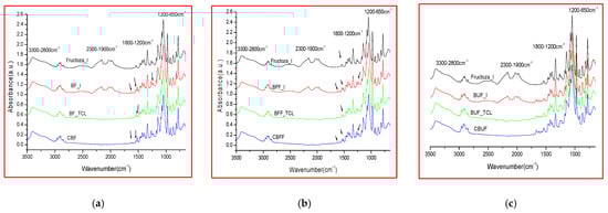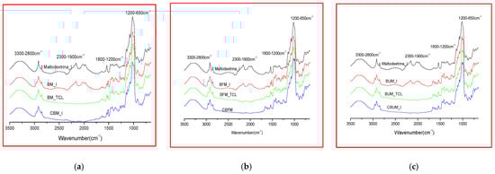 Two categories of microencapsulated products were obtained from each oily formulation (Biomicin, Biomicin Forte, and Biomicin Urinary); the first one using fructose as a matrix and the second one using maltodextrin. Comparative spectra were registered for each sample at initial stage (I), after light irradiation at room temperature (TCL) and after inclusion in biopolymer capsules (C) (Figure 3 and Figure 4, respectively). For abbreviations, see Materials and Methods. Figure S1 shows the superposed ATR-FTIR-MIR spectra (3500–650 cm−1) of matrices fructose (a) and maltodextrin (b) at initial stage (I) and after daylight irradiation over 14 days at 25 °C (TCL). Tables S4–S9 include the wavenumbers and peak intensities for each experimental variant.