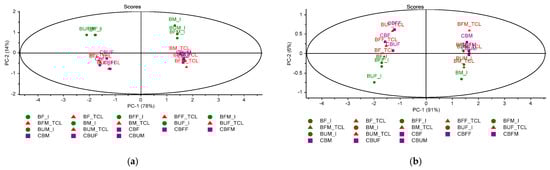 Principal component analysis (PCA) score plots corresponding to the IR region 3600–650 cm−1 (a) and 1800–650 cm−1 (b) including the comparative fingerprints of microencapsulated products Biomicin (B), Biomicin Forte (BF), and Biomicin urinary (BU) using fructose (F) vs. maltodextrin (M) as matrices, at initial stage (I), after light irradiation at room temperature (TCL), and after inclusion in biopolymer capsules (C). For abbreviations, see Materials and Methods.