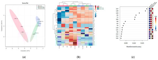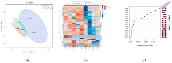 Partial least squares with discriminant analysis (PLSDA) score plot (a), heatmap (b), and RF ranking analysis (c) of microencapsulated products Biomicin, Biomicin Forte, and Biomicin urinary using maltodextrin (M) as a matrix, at the initial stage (I), after light irradiation at room temperature (TCL), and after inclusion in biopolymer capsules (C). For abbreviations, see Materials and Methods.