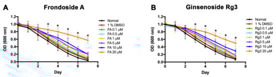 Food clearance assay was performed to determine the effects of FA and Rg3 on C. elegans N2 feeding activity and toxicity [60]. FA and Rg3 were purchased from Sigma Aldrich (St. Louis, MO, USA). Both FA and Rg3 compounds were dissolved in DMSO to obtain various doses at 0.1, 0.5, 1, 5, 10, and 20 μM, with the final concentration of 1% (v/v) DMSO in treated cultures. OP50 E. coli were cultured in Luria−Bertani (LB) broth for 16 h, and then the optical density was adjusted at 600 nm (OD600) to 7.0 in S-medium (5.85 g NaCl, 1 g K2HPO4, 6 g KH2PO4, 1 mL cholesterol in ethanol, and distilled H2O up to 1L). Seventy-five microliters of the solution containing 60 μL of E. coli suspension, 10 μL of the compounds at various doses in S-medium, and 5 μL of S-medium containing 10 synchronized L1 N2 animals was incubated in a 96-well plate at 25 °C. The absorbance at 600 nm (OD600) was measured daily for 6 days using a versa max tunable microplate reader (Molecular Devices, Sunnyvale, CA, USA). The experiment was performed in triplicate independently.
