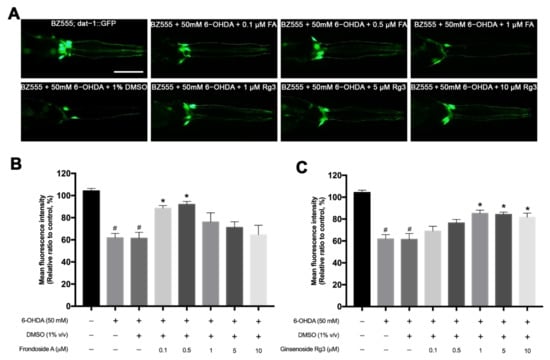Worms were treated with 6-OHDA (Sigma Aldrich, St. Louis, MO, USA) to selectively induce the degeneration of DAergic neurons [28]. The synchronized L3 larvae were incubated in a solution containing diluted OP50 mixed with 50 mM 6-OHDA and 10 mM ascorbic acid (Sigma Aldrich, St. Louis, MO, USA). The solution was mixed gently with a pipette every 10 min for 1 h at 20 °C. After induction, the worms were washed three times with M9 buffer and then transferred to OP50/NGM plates containing various doses at 0.1, 0.5, 1, 5, and 10 μM of FA and Rg3, and 50 μM 5-fluoro-2′-deoxyuridine (FUDR; Sigma Aldrich, St. Louis, MO, USA) that was used to suppress the new progeny production and treated for 72 h at 20 °C. In control experiments, the 6-OHDA-induced worms were incubated in OP50/NGM plates containing 1% (v/v) DMSO without the compounds (number of worms = 40–50 animals/group per replicate).