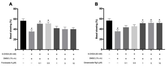 Graphical representations for the basal slowing rate in 6-OHDA-induced N2 C. elegans treated with FA (A) and Rg3 (B). The hash (#) indicates a significant difference between 6-OHDA-induced and uninduced worms (p < 0.05). The asterisk (*) indicates a significant difference between the 6-OHDA-induced control worms and the FA/6-OHDA- or Rg3/6-OHDA-treated worms (p < 0.05). The experiment was performed independently at least three times (number of worms = 40–50 animals/group per replicate).