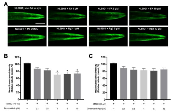 Analysis of α-synuclein accumulation was performed in the NL5901 strain treated with FA or Rg3 [43]. Synchronized L1 larvae were transferred onto the NGM plates containing various doses of FA, Rg3, and 150 mM FUDR and incubated for 72 h at 20 °C. Then, treated NL5901 worms were washed with M9 buffer, mounted onto agarose pad slides with 100 mM sodium azide, and enclosed with a slide cover glass. The fluorescence intensity of the accumulated α-synuclein in the worm muscles was assessed using a fluorescence microscope and quantified by using ImageJ software. The experiment was performed independently at least three times (number of worms = 40–50 animals/group per replicate).