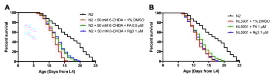 Effects of FA and Rg3 on lifespan of 6-OHDA-induced and transgenic α-synuclein NL5901 worms. (A) Survival curves of wild-type N2, 6-OHDA-induced, and FA/Rg3-treated worms. (B) Survival curves of wild-type N2, DMSO-cultured NL5901 and FA/Rg3-treated NL5901. The experiment was performed independently at least three times (number of worms = 30–40 animals/group per replicate).