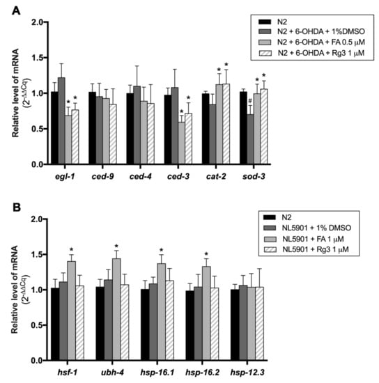 (A) Fold change of gene expression levels (2−(ΔΔCq)) of apoptosis genes in N2 worms treated with 6-OHDA, 6-OHDA/FA and 6-OHDA/Rg3. (B) Fold change of gene expression levels of protein degradation regulator genes in NL5901 worms treated with FA and Rg3. All targeted genes were measured in triplicate, and three independent biological triplicates were performed in each condition. The hash (#) indicates a significant difference between 6-OHDA-induced and uninduced worms (p < 0.05). The asterisk (*) indicates a significant difference between the control worms and the FA or Rg3-treated worms (p < 0.05).