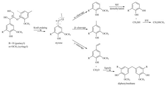 Studies on structural modifications during kraft pulping indicated that β-O-4 structures, with hydroxyl or carbonyl groups attached at the α or γ positions, underwent β-ether cleavage, resulting in styrene-like compounds, which then further degraded leading to side chain cleavage at the α, β, or γ-carbon positions as shown in Figure 1 [,]. The splitting of the side chain from the C9 unit caused a reduced C9 MW for KL. Also, linkages involving side chain cleavage at the γ-carbon position produced formaldehyde which eventually reacted with other lignols to form condensed products like diphenylmethane []. These condensed products increased the carbon content of KL. The demethylation reaction caused by the attack of sulfide ions to the methoxyl group at C-3 or C-5 resulted in the formation of methylmercaptan (CH3SH) and then further oxidation produced dimethyldisulfide (CH3SSCH3) []. The demethylation caused reduced methoxyl content for KL compared to MWLs.