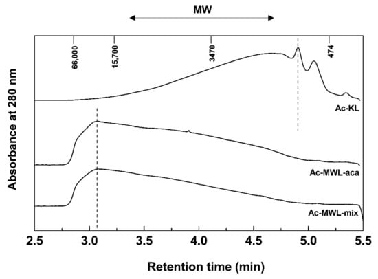 The weight-average (Mw) and number-average (Mn) MW, and polydispersity index (PDI) of acetylated KL (Ac-KL) and acetylated MWLs (Ac-MWLs) were determined by gel permeation chromatography (GPC). The MW distribution of Ac-KL and Ac-MWLs are shown in Figure 2 while the Mw, Mn, and PDI are given in Table 4. As shown in Figure 2, the MW distributions of KL and MWL were very different. In the case of KL, the low MW (less than 10,000) fractions were predominant, and in particular, two peaks were observed at a MW of 1000 or less. On the other hand, the MW distribution of the two types of MWLs had no remarkable difference.