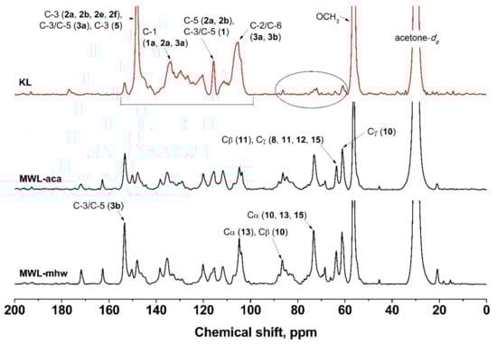 The aromatic ring resonated in the range of 100 to 160 ppm. The most intense peaks in this region for hardwood MWLs were evident at 103.8–104.9 and 153.4 ppm, which represented the C-2/C-6 and C-3/C-5 of etherified syringyl nuclei. These peaks are specific to hardwood guaiacyl-syringyl (GS) lignins []. The peak at 153.4 ppm was weak in KL, suggesting decreased methoxyl content due to demethylation or demethoxylation reactions during kraft pulping. In addition, the C-1/C-4 peak of etherified syringyl nuclei at 138.5 ppm was absent in KL, suggesting a high degree of splitting at the α-carbon position.