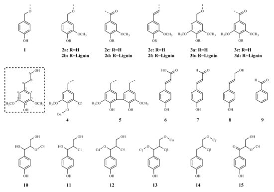 Lignin substructures (1–5) and side chains (6–15) corresponding to 13C NMR assignments.