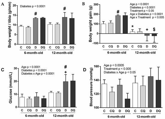 Basic characteristics of experimental animals: body weight/tibia ratio (A), body weight gain (B), blood glucose concentration (C), systolic blood pressure (D). Abbreviations: C—lean control vehicle-treated, CQ—lean control quercetin-treated, D—Zucker diabetic fatty (ZDF) vehicle-treated, DQ—ZDF quercetin-treated. * p < 0.05 versus 6-month-old C group, + p < 0.05 versus 6-month-old D group, # p < 0.05 versus age-matched C group, $ p < 0.05 versus age-matched D group. Data are presented as means ± standard deviations.