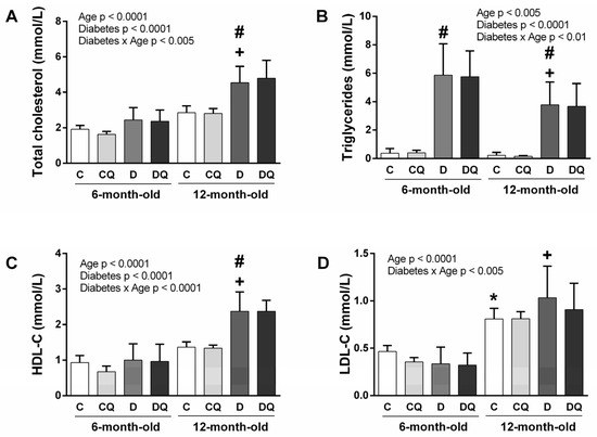 Parameters of lipid metabolism. Concentration of total cholesterol (A), triglycerides (B), HDL-cholesterol (C), LDL-cholesterol (D). Abbreviations: C—lean control vehicle-treated, CQ—lean control quercetin-treated, D—Zucker diabetic fatty (ZDF) vehicle-treated, DQ—ZDF quercetin-treated. * p < 0.05 versus 6-month-old C group, + p < 0.05 versus 6-month-old D group, # p < 0.05 versus age-matched C group. Data are presented as means ± standard deviations.