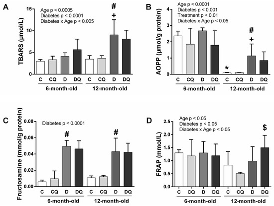 Parameters of oxidative stress and antioxidant status determined by ferric reducing antioxidant power (FRAP) in blood plasma: thiobarbituric acid reactive substances (TBARS) (A), advanced oxidation protein products (AOPP) (B), fructosamine (C), FRAP (D). Abbreviations: C—lean control vehicle-treated, CQ—lean control quercetin-treated, D—Zucker diabetic fatty (ZDF) vehicle-treated, DQ—ZDF quercetin-treated. * p < 0.05 versus 6-month-old C group, + p < 0.05 versus 6-month-old D group, # p < 0.05 versus age-matched C group, $ p < 0.05 versus age-matched D group. Data are presented as means ± standard deviations.