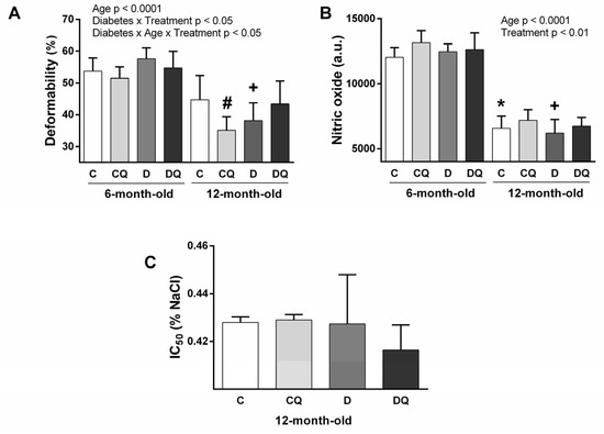 Parameters of erythrocytes: erythrocyte deformability (A), nitric oxide production by erythrocytes (B), osmotic resistance of erythrocytes determined by the concentration of NaCl providing 50% hemolysis—IC50 (C). Abbreviations: C—lean control vehicle-treated, CQ—lean control quercetin-treated, D—Zucker diabetic fatty (ZDF) vehicle-treated, DQ—ZDF quercetin-treated. * p < 0.05 versus 6-month-old C group, + p < 0.05 versus 6-month-old D group, # p < 0.05 versus age-matched C group. Data are presented as means ± standard deviations.