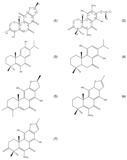 The structures of the known compounds were established by comparison of their physicochemical and spectral data with reported data, and they were identified as 6,12-dihydroxyabieta-5,8,11,13-teraen-7-one (2) [5], 11,14-dihydroxy-8,11,13-abietatrien-7-one (3) [6], crolerodendrum A (4) [7], cyrtophyllone A (5) [8], and (10R,16S)-12,16-epoxy-11,14-dihydroxy-6-methoxy-17(15→16)-abeo-abieta-5,8,11,13-tetraen-3,7-dione (6) [9], respectively.