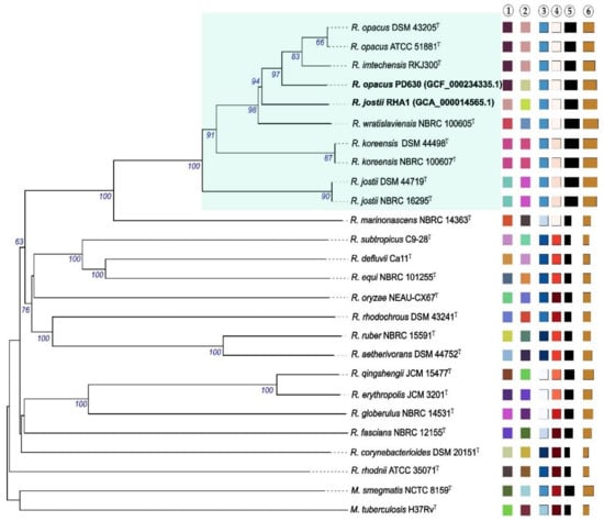 Phylogenomic tree inferred using the Type Strain Genome Server (https://tygs.dsmz.de/ accessed on 13 February 2021) by Genome BLAST Distance Phylogeny approach (GBDP), using distances calculated from genome sequences. The branch lengths are scaled in terms of GBDP distance formula d5. The numbers below branches are GBDP pseudo-bootstrap support values >60% from 100 replications, with an average branch support of 79.8%. The tree was rooted at the midpoint. The light blue box highlights Rhodococcus species (including oleaginous strains RHA1 and PD630) belonging to the group C, according to the classification proposed by Sangal et al. [10]. Leaf labels are annotated by affiliation to ① species and ② subspecies clusters, predicted by the digital DNA:DNA hybridization (dDDH) calculator service; ③ genomic G+C content (Min. 61.7%