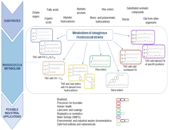 These studies demonstrate the wide metabolic repertoire of oleaginous rhodococci for the degradation of aromatic compounds and their good potential for converting these substances into lipids, such as TAG and WE, with a diversity of chemical structures (Figure 2).