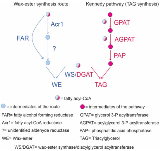 WE production occurs in Gram-negative species such as Acinetobacter baylyi, Acinetobacter calcoaceticus, Psychrobactercryohalolenti K5, and Marinobacter aquaeolei VT8 [118,119] from preformed compounds or synthesized de novo from diverse carbon sources. WE biosynthesis in Acinetobacter sp. involves three enzymatic reactions [120]. First, an acyl-CoA is reduced by a NADPH acyl-CoA reductase, named Acr1, to its corresponding fatty aldehyde. Then, an unidentified NADPH fatty aldehyde reductase uses the fatty aldehyde as substrate synthesizing the corresponding fatty alcohol. Finally, the WE are formed by a fatty acyl-CoA connected to a fatty alcohol by an ester bond (Figure 3). In Marinobacter aquaeolei VT8, this pathway involves only two metabolic steps because its fatty acyl-CoA reductase is able to catalyze the four-electron reduction of the fatty acyl-CoA to the fatty alcohol [121]. The last step is similar in both strains. The reaction is catalyzed by a wax ester synthase (WS) that could also function as an acyl-CoA diacylglycerol acyltransferase (DGAT) for TAG synthesis. Thus, the metabolic pathways for both neutral lipids production are intertwined. They share not only a fatty acyl-CoA residue as a substrate but also the WS/DGAT enzyme catalyzing the final reaction (Figure 3).