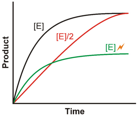 Exemplary product-over-time progression curves for an exemplary enzymatic reaction. The product-over-time curves are shown for different conditions including different enzyme concentrations ([E] and [E]/2 shown in black and red) and inhibited or degraded enzyme (green). [E], enzyme concentration.