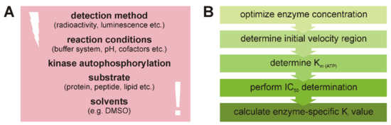 Considerations and suggested workflow for in vitro kinase inhibitor characterization. (A) Apart from basic considerations concerning the detection method to be used and the reaction conditions, also enzyme- and substrate-specific characteristics need to be taken into account. (B) The suggested workflow consists of five steps resulting in generation of major parameters essential to calculate Ki values, which can be easily used to compare inhibitory effects for various SMIs and different enzymes.