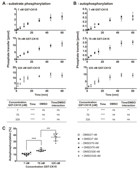 In a first step the initial velocity region for GST-tagged CK1δ was determined by measuring the time-dependent substrate phosphorylation of α-casein using different enzyme concentrations (7, 70, and 335 nM) (Figure 3A). For the determination of the initial velocity region, the phosphate donor ATP was used at a concentration of 10 µM (equal to 150 pmol per reaction). Additionally, the influence of the inhibitor solvent DMSO was investigated (Figure 3B,C). The corresponding time-dependent autophosphorylation of GST-tagged CK1δ was determined by measuring phosphate incorporation into GST-CK1δ.