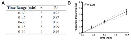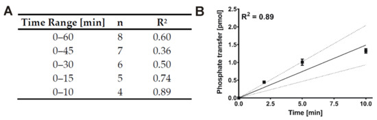 Determination of initial velocity linear region for GST-CK1δ. (A) In order to determine the maximum coefficient of determination (R2) linear regression analysis was conducted with stepwise decreasing the number of included time points of the product-over-time progression curve determined for GST-CK1δ (7 nM). (B) Linear regression for the determined initial velocity region (10 min) including R2 value and confidence bands (95%). n, sample size; R2, coefficient of determination.