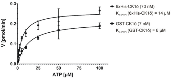 In order to determine the Km (ATP) values for GST-CK1δ and 6×His-CK1δ Michaelis-Menten enzyme kinetic analysis was performed under the defined initial velocity conditions using varying ATP concentrations ranging from 0.5 to 100 µM (Figure 7). The resulting Km (ATP) is defined as the concentration of the co-substrate ATP at which the respective enzymatic velocity of GST-CK1δ or 6×His-CK1δ is half of its maximal value. The calculated Km (ATP) for 6×His-CK1δ was 14 µM, whereas for GST-CK1δ, a Km (ATP) value of 6 µM was determined by using 7 nM concentration of GST-CK1δ and 70 nM of 6×His-CK1δ in kinase reactions performed for 10 min (see data above for determination of ideal/minimal enzyme concentration and initial velocity region). In order to simplify the transformation of the IC50 to the Kic value according to the Cheng-Prusoff equation (see introduction section for detailed explanation), ATP concentrations equivalent to the calculated Km (ATP) values were used in subsequent experiments with the aim to determine IC50 values.