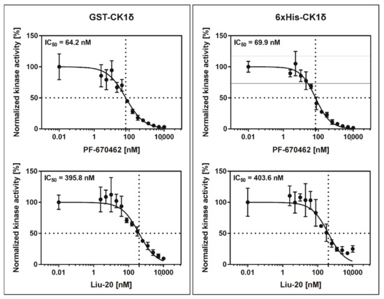 According to our workflow with the aim of determining comparable parameters for SMIs, IC50 values for GST-CK1δ and 6×His-CK1δ were determined using the defined initial velocity conditions and an ATP concentration equivalent to the calculated Km (ATP) values. As appropriate examples for previously reported and established SMIs the CK1-specific ATP-competitive inhibitors PF-670462 [12] and Liu-20 [30] were used for determination of IC50 values (Figure 8 and Table 2). The determined IC50 values show high comparability between GST- and 6×His-tagged CK1δ: IC50 values were calculated with 69.85 nM (PF-670462) and 395.80 nM (Liu-20) for GST-CK1δ and 64.18 nM (PF-670462) and 403.60 nM (Liu-20) for 6×His-CK1δ.