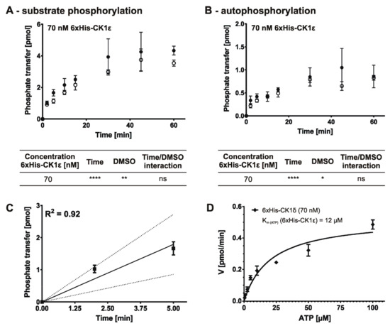 Because we expected a similar level of activity for 6×His-CK1ε as for the previously tested 6×His-CK1δ, the same enzyme concentration of 70 nM was also used for 6×His-CK1ε. As formerly demonstrated for GST- and 6×His-CK1δ, the solvent DMSO also showed a significant influence on the time-dependent substrate phosphorylation by 6×His-CK1ε (Figure 9A,B). Linear regression analysis with stepwise decreasing the number of included time points indicated an optimal time range of 5 min (R2 = 0.92) for the initial velocity region as tested for 70 nM concentration of 6×His-CK1ε (Figure 9C). Consequently, subsequent kinase reactions including the determination of the Km (ATP) and IC50 for 6×His-CK1ε were conducted using an enzyme concentration of 70 nM and a reaction time of 5 min.